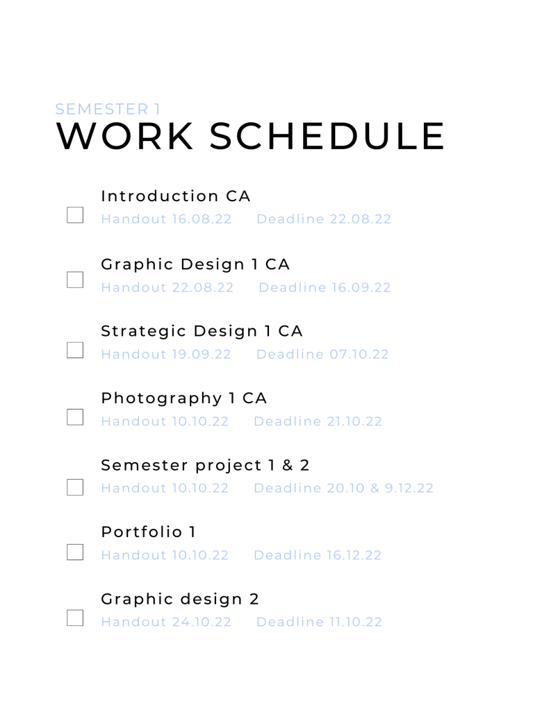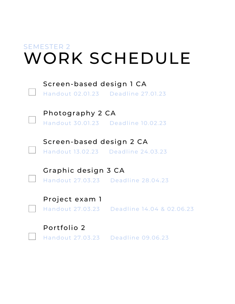 So, I have gained insight into my work schedule for both of my upcoming semesters. I created a simple document listing all handouts and deadlines for semesters 1 and 2. This makes it easier for me to keep track of course assignments, exams, and portfolios. That's why I also include checkpoints to cross off when I've finished something.